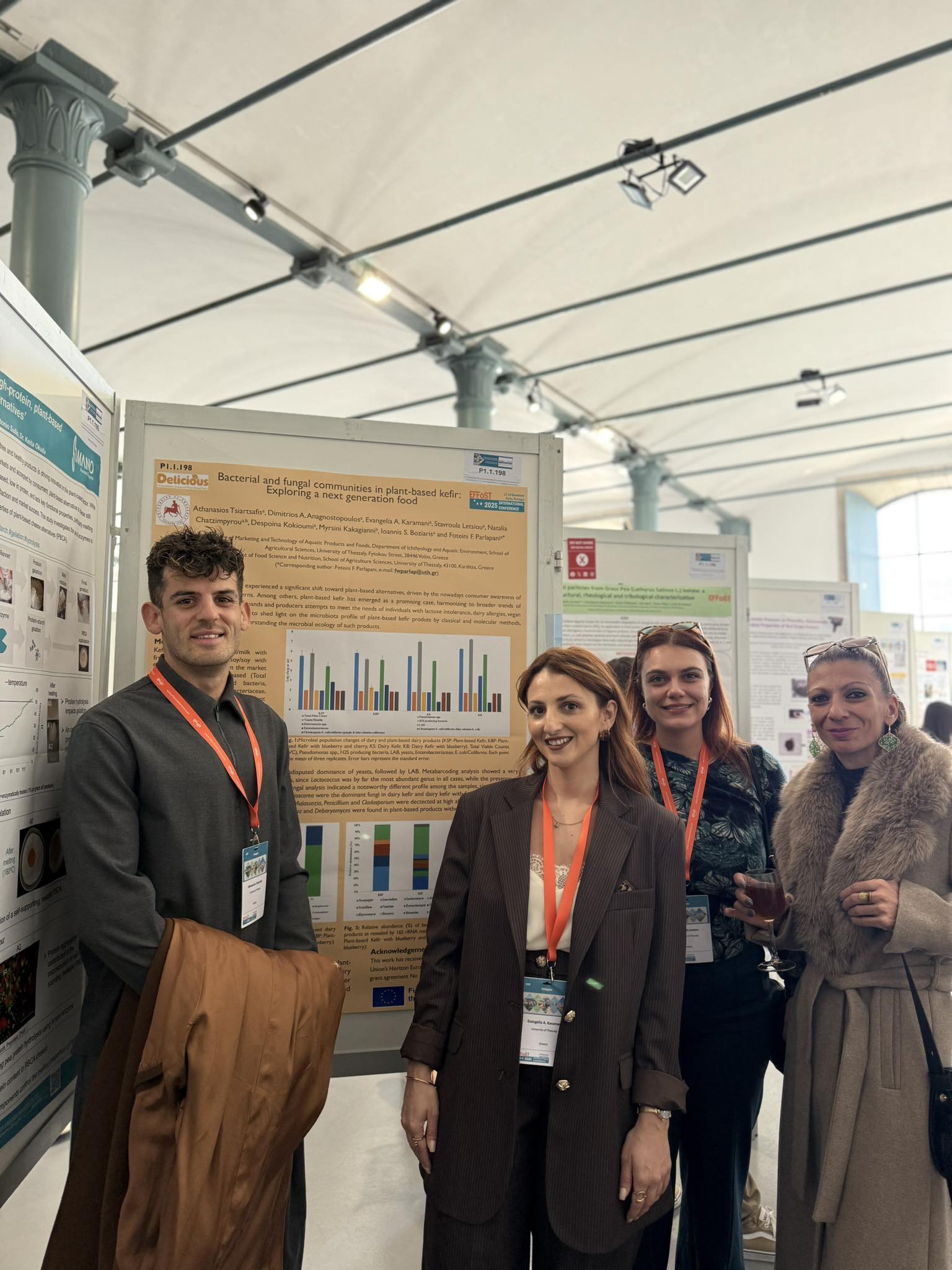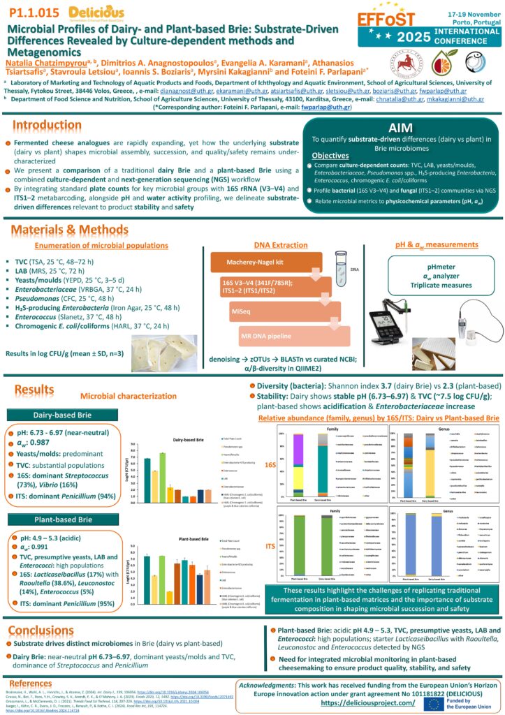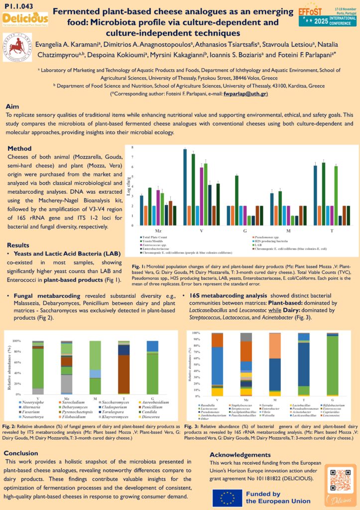 The results of the UTH research team (produced under the supervision of PI: Associate Professor F.F. Parlapani), within the framework of the Delicious project, regarding the bacterial and fungal status of plant-based cheese, kefir, and Brie compared to animal origin, using classical microbiological analysis (for the enumeration of microbial populations) and Next Generation Sequencing (16S rRNA and ITS sequencing for the exploration of bacterial and fungal communities, respectively), were successfully presented at the 39th European Federation of Food Science and Technology (EFFoST) International Conference, Fostering the Transition to Sustainable Food Systems: Embracing Novelty and Overcoming Challenges, hosted by Universidade Católica Portuguesa – Faculty of Biotechnology and held in Porto, Portugal, on 17–19 November 2025.